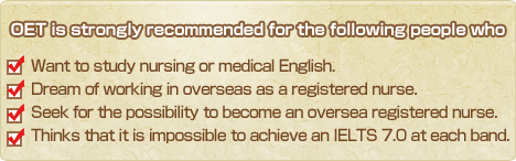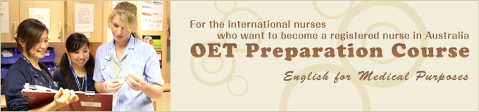 - The reason why I started taking this course is that as I work for a medical facility, I thought I should have something to prove that I did something more and that is nursing in Australia. I always wanted to view my life in Australia objectively so that I could evaluate myself in Australia. Because I was working as an assistant nurse at medical facility in Australia, I felt I didn’t want to take IELTS or TOEIC, but the OET; this was enough reason for me to make the decision to take this course.By actually taking the course, I honestly would like to recommend this course to not only to those who want to become a registered nurse in Australia but also those who help patients in any ways. The reason for this is that I learned how to write the items and abbreviated forms used in a medical environment, and even some vocabulary you cannot find in the ordinary dictionary! It is very advantageous that I can ask questions to a professional nurse while I could not ask nurses at the place I work since those nurses are not teachers to teach English for an oversea nurse like me at work. More than that, it is very practical learning the English which is actually spoken in the hospital.